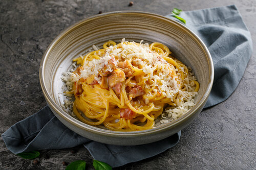 Карбонара, как к сожалению оказалось, не на желтках, а на сливочной заготовке из пакета с вообще не жаренным беконом и больше напоминает внебрачного сына карбонары и пасты альфредо.